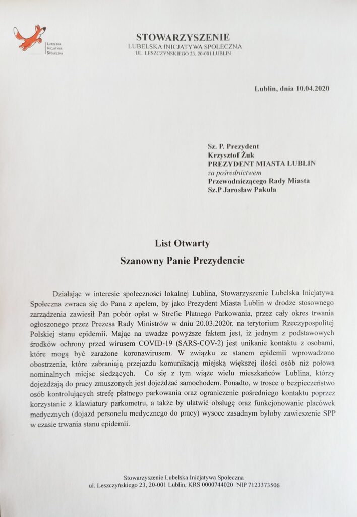 Stowarzyszenie „Lubelska Inicjatywa Społeczna” wystosowało apel do prezydenta Lublina, Krzysztofa Żuka, w którym prosi o zawieszenie opłat za parkowanie w Strefie Płatnego Parkowania w mieście. Decyzja ta wynika z obecnej sytuacji epidemicznej i jest podejmowana w trosce o bezpieczeństwo mieszkańców oraz pracowników kontrolujących strefę.