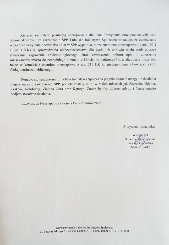 Apeluje się do władz miasta, aby podjęły odpowiednie kroki i tymczasowo zawiesiły opłaty za parkowanie w Strefie Płatnego Parkowania w Lublinie, w celu zapewnienia bezpieczeństwa i ułatwienia funkcjonowania w trudnym czasie epidemii.